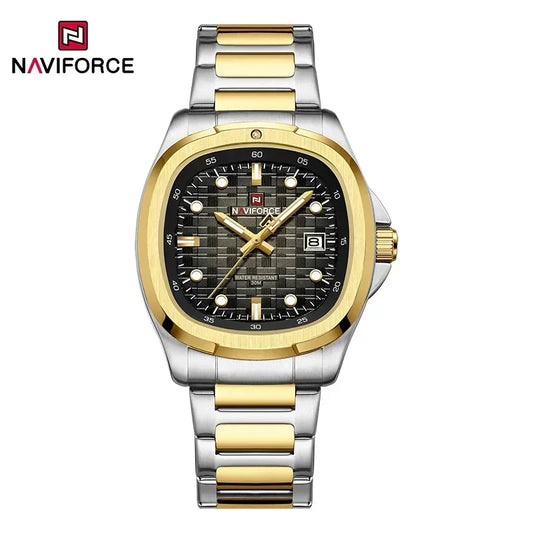 NAVIFORCE 9240 ساعة كوارتز فاخرة بسيطة للرجال بمينا مربع، تقويم، عقارب مضيئة، مقاومة للماء، وسوار من الفولاذ المقاوم للصدأ